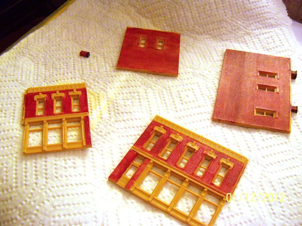 This morning I discovered that when I painted the brick onto the factory and "discovered" the new (to me) technique of painting mortar after the brickwork itself, it must have been at least a day or two (or a week, as I was working on it weekends), because acrylic, while dry to the touch, may take days to fully "cure". After about 14 hours, I went to apply white mortar to one seemingly dry wall of the newest building, and turned it pink. The white paint must have rehydrated the red mortar and mixed with it after I had gone to wipe off the white. Ugh. I did a small patch, so maybe instead of repainting (again), I'll put a sign there.